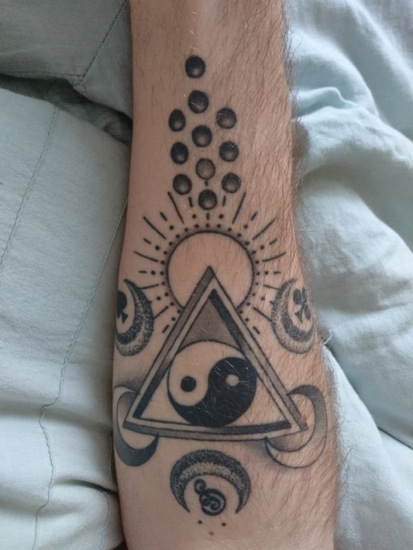 男生手臂上黑色点刺几何三角形山水风景纹身图片