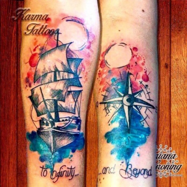 纹身指南针 水彩与线条结合的指南针纹身图案
