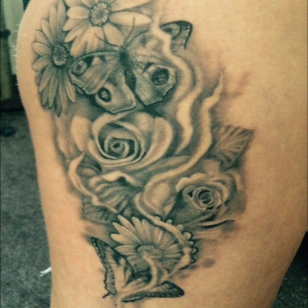 花朵纹身图案 漂亮精致的玫瑰花与蝴蝶纹身花朵图案
