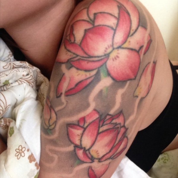 非常霸气的半甲经典彩色鲤鱼花卉纹身图案