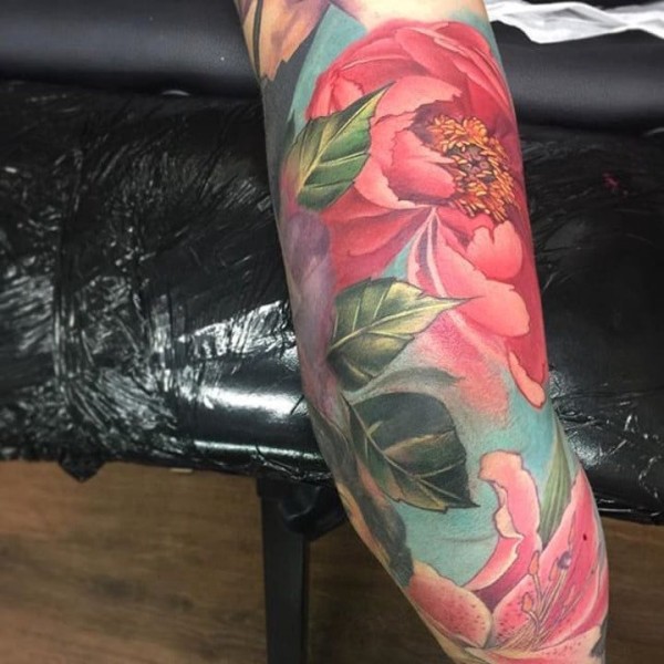彩色花朵纹身 唯美妖艳的彩色花卉包臂纹身图案