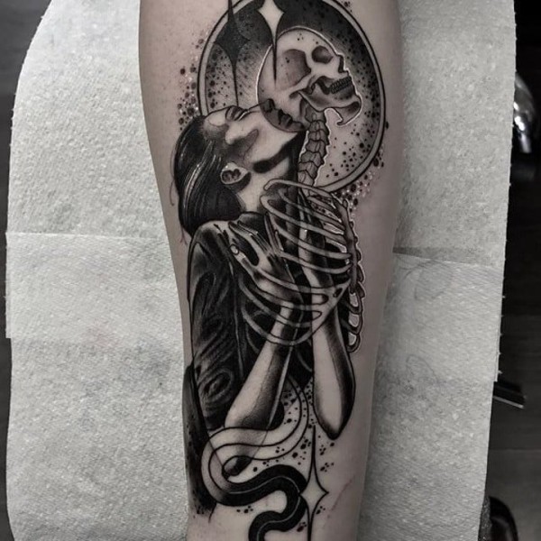 超帅时尚的黑灰骷髅与蛇纹身图案