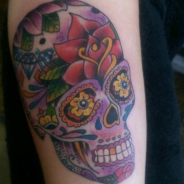 彩色花骷髅手臂纹身图片