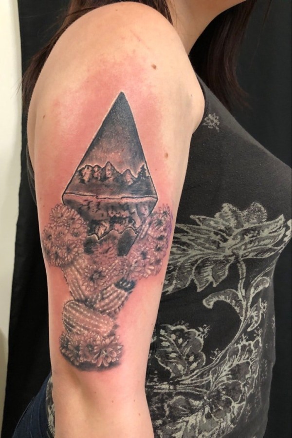 男生手臂上黑色点刺几何三角形山水风景纹身图片