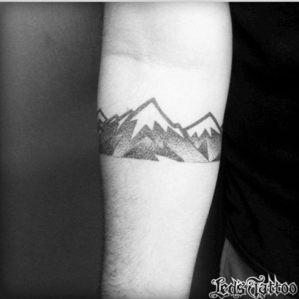 男生手臂上黑色点刺几何三角形山水风景纹身图片
