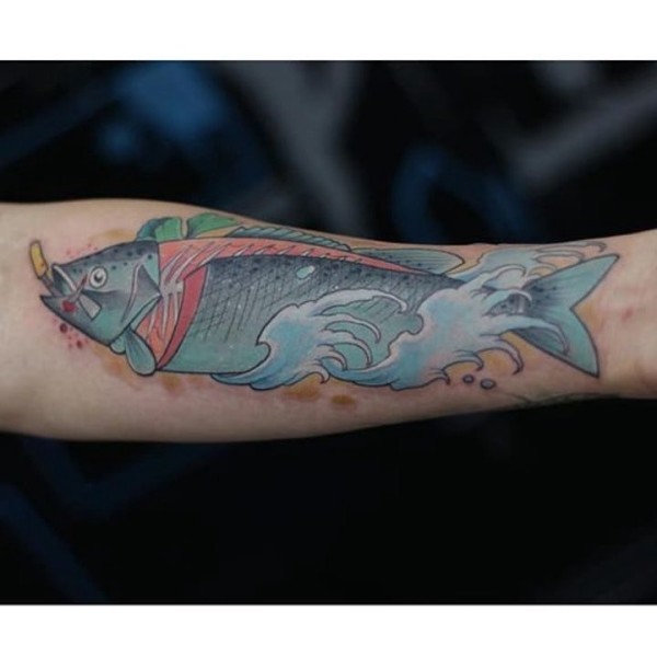 蝙蝠,幼狮,鲤鱼组成的花臂纹身