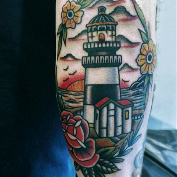 彩色灯塔玫瑰花纹身图片由纹身图吧提供