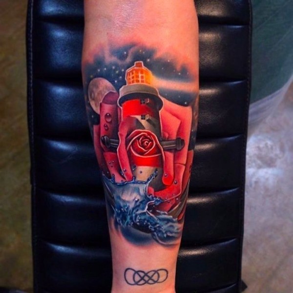 彩色灯塔玫瑰花纹身图片由纹身图吧提供