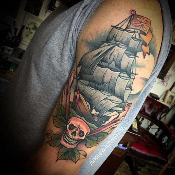大臂纹身图 男生大臂上阴森的海盗船纹身图片