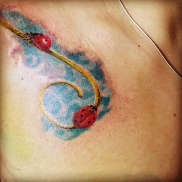 肩部色彩鲜艳的瓢虫纹身图案