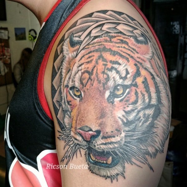 oldschool黄红色调的老虎头纹身图案