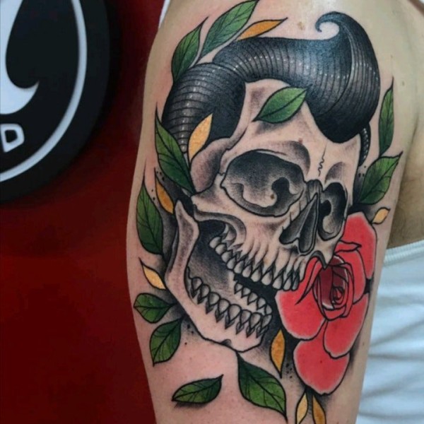手臂彩色玫瑰花骷髅头纹身手稿图案