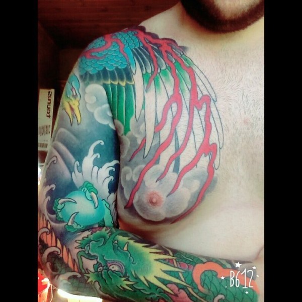 过肩龙纹身,黑色云雾搭配很贴切