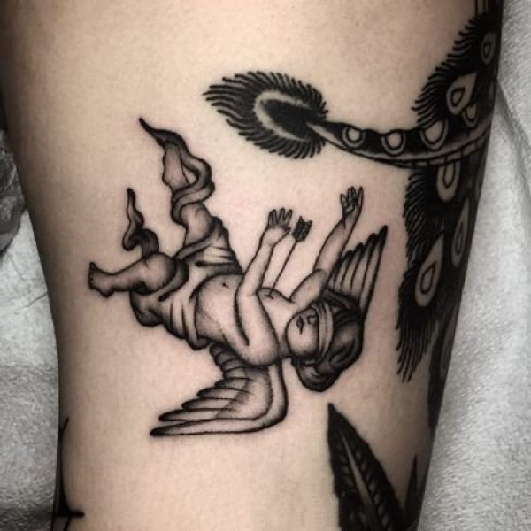 腿部黑灰天使纹身图案_天使纹身图案大全_纹身图吧