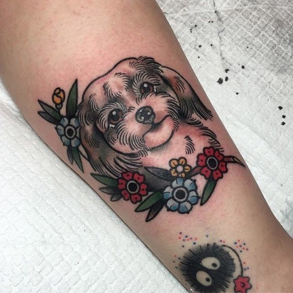 大腿上彩色植物纹身小花朵和狗头纹身图片