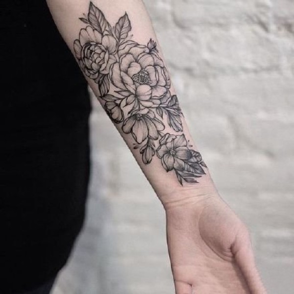 大臂素花纹身 9款女士的大臂黑灰花朵植物纹身图案