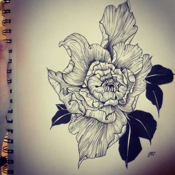 黑灰色玫瑰花和骷髅头纹身图片手稿