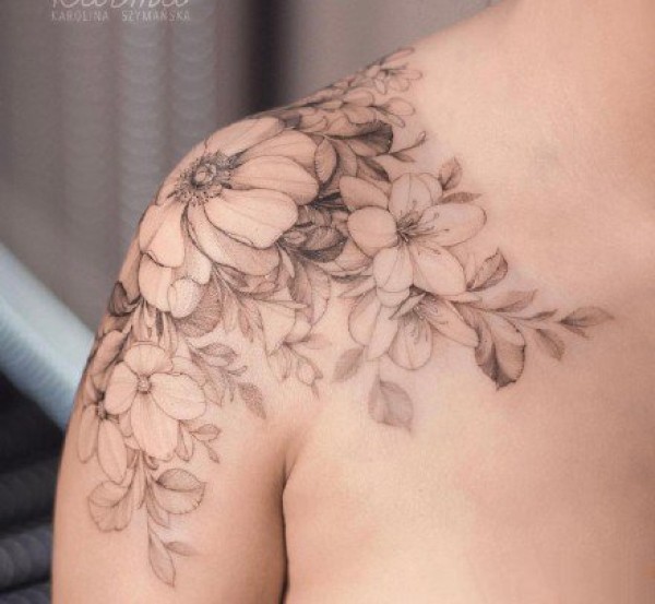大臂素花纹身 9款女士的大臂黑灰花朵植物纹身图案