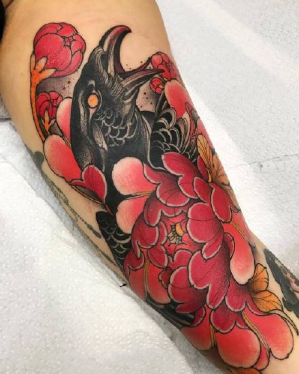 小臂new school乌鸦花朵纹身图案