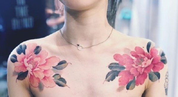 古典精致的彩色花臂牡丹花艺妓海浪纹身图案