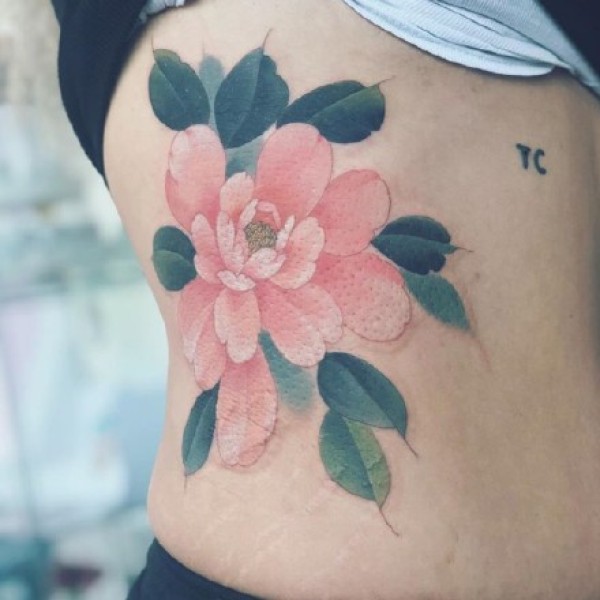古典精致的彩色花臂牡丹花艺妓海浪纹身图案
