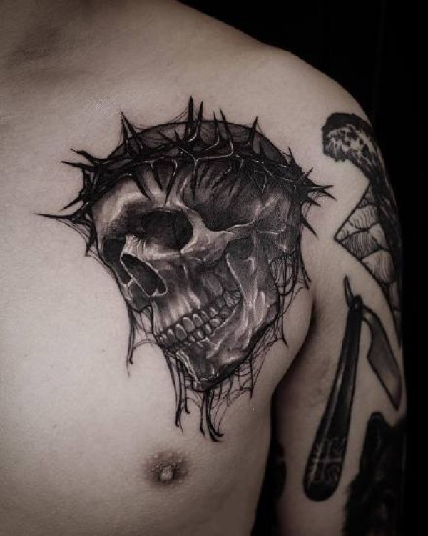 超帅时尚的黑灰骷髅与蛇纹身图案