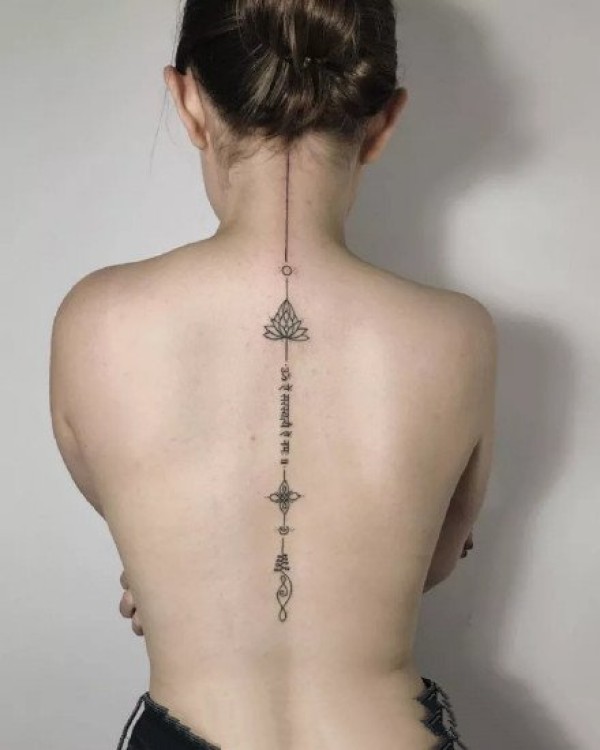 女生后腰纹身黑白灰风格抽象线条纹身图案