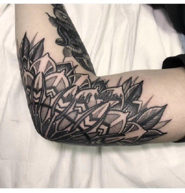 胳膊肘纹身 9张纹在手臂胳膊肘处的点刺梵花纹身图片