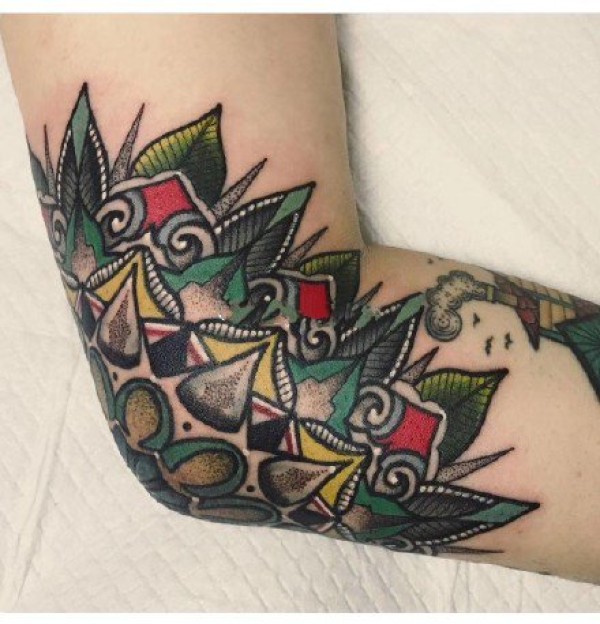 胳膊肘纹身 9张纹在手臂胳膊肘处的点刺梵花纹身图片