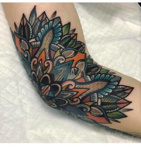 胳膊肘纹身 9张纹在手臂胳膊肘处的点刺梵花纹身图片