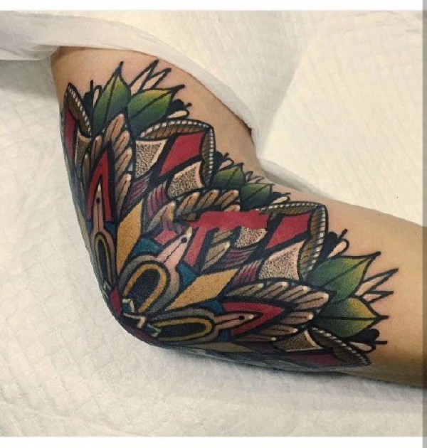 胳膊肘纹身 9张纹在手臂胳膊肘处的点刺梵花纹身图片
