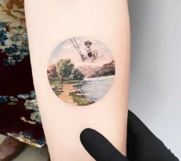 圆形风景纹身 小臂上的一组圆图形里的小风景纹身图案