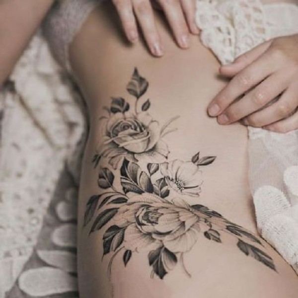 性感大腿纹身 女士大腿处性感的花花纹身图片