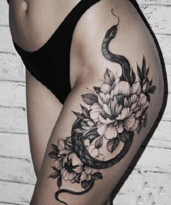 性感大腿纹身 女士大腿处性感的花花纹身图片