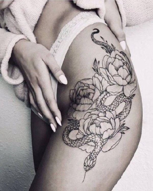 性感大腿纹身 女士大腿处性感的花花纹身图片