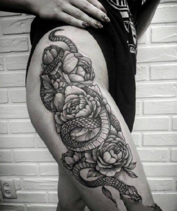 性感大腿纹身 女士大腿处性感的花花纹身图片