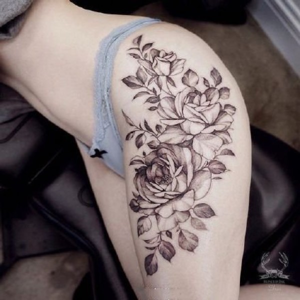 性感大腿纹身 女士大腿处性感的花花纹身图片