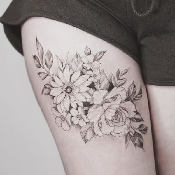 性感大腿纹身 女士大腿处性感的花花纹身图片