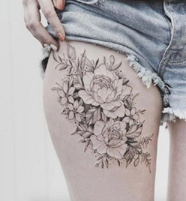 性感大腿纹身 女士大腿处性感的花花纹身图片