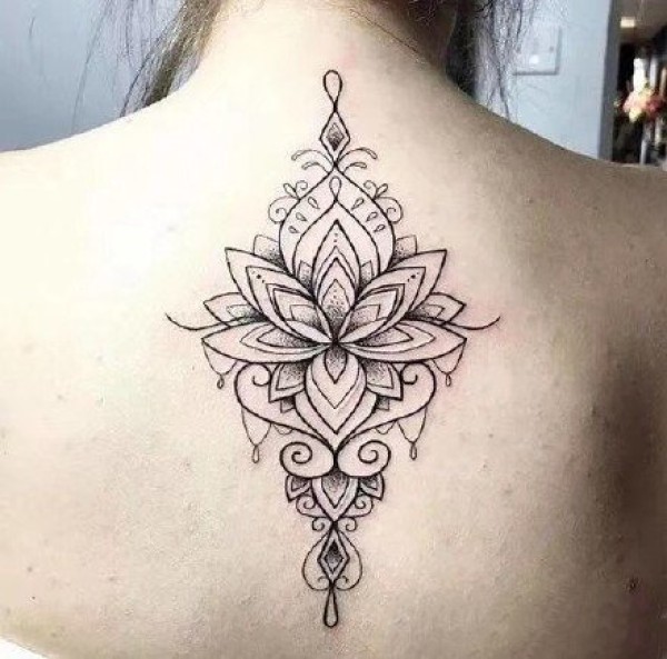 后背纹身梵花 女生后脖子到后背脊柱处的莲花梵花纹身图片
