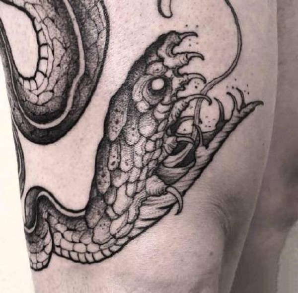 男生胸部黑色点刺几何简单线条小动物蛇和鳄鱼纹身图片