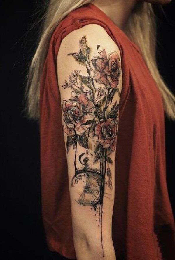 手臂胳膊上的欧美黑灰钟表玫瑰纹身图案9张