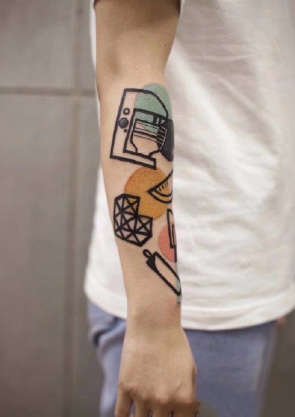 手臂纹身素材 男生手臂上艺妓和般若拼接纹身图片