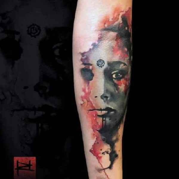 暗色水彩风格的欧美女郎肖像包臂纹身图片