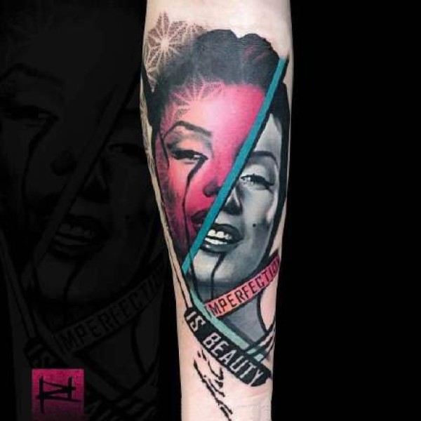 暗色水彩风格的欧美女郎肖像包臂纹身图片