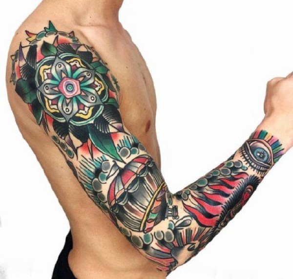 oldschool风格的拼接花臂纹身作品欣赏