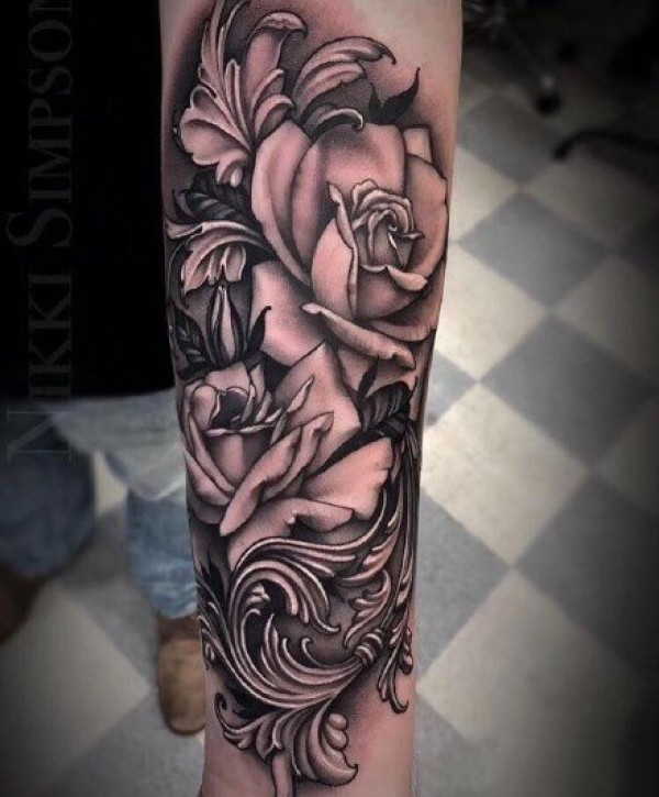 女性手臂上漂亮的玫瑰花纹身图案