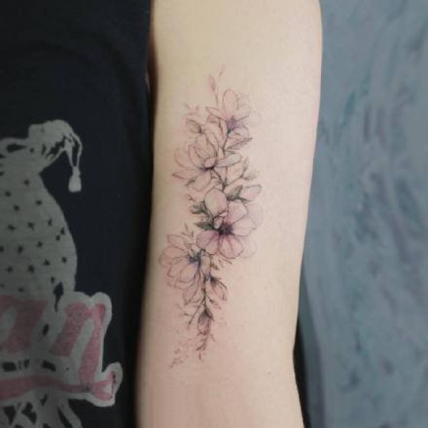 纹在手臂胳膊上的黑灰素花花卉纹身图案欣赏