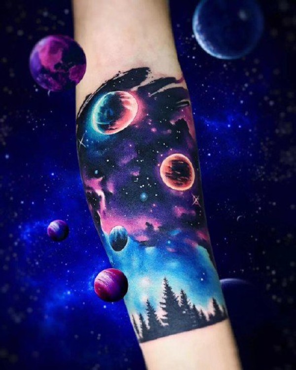 一组炫彩色星空星球宇宙相关的纹身图案作品