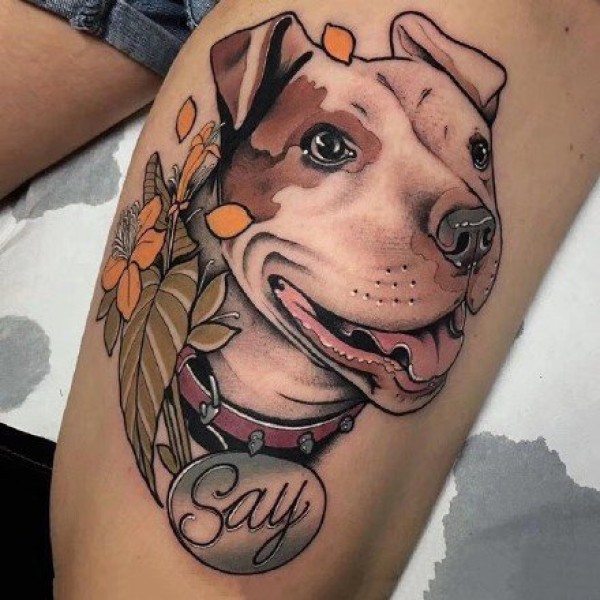 大腿上彩色植物纹身小花朵和狗头纹身图片